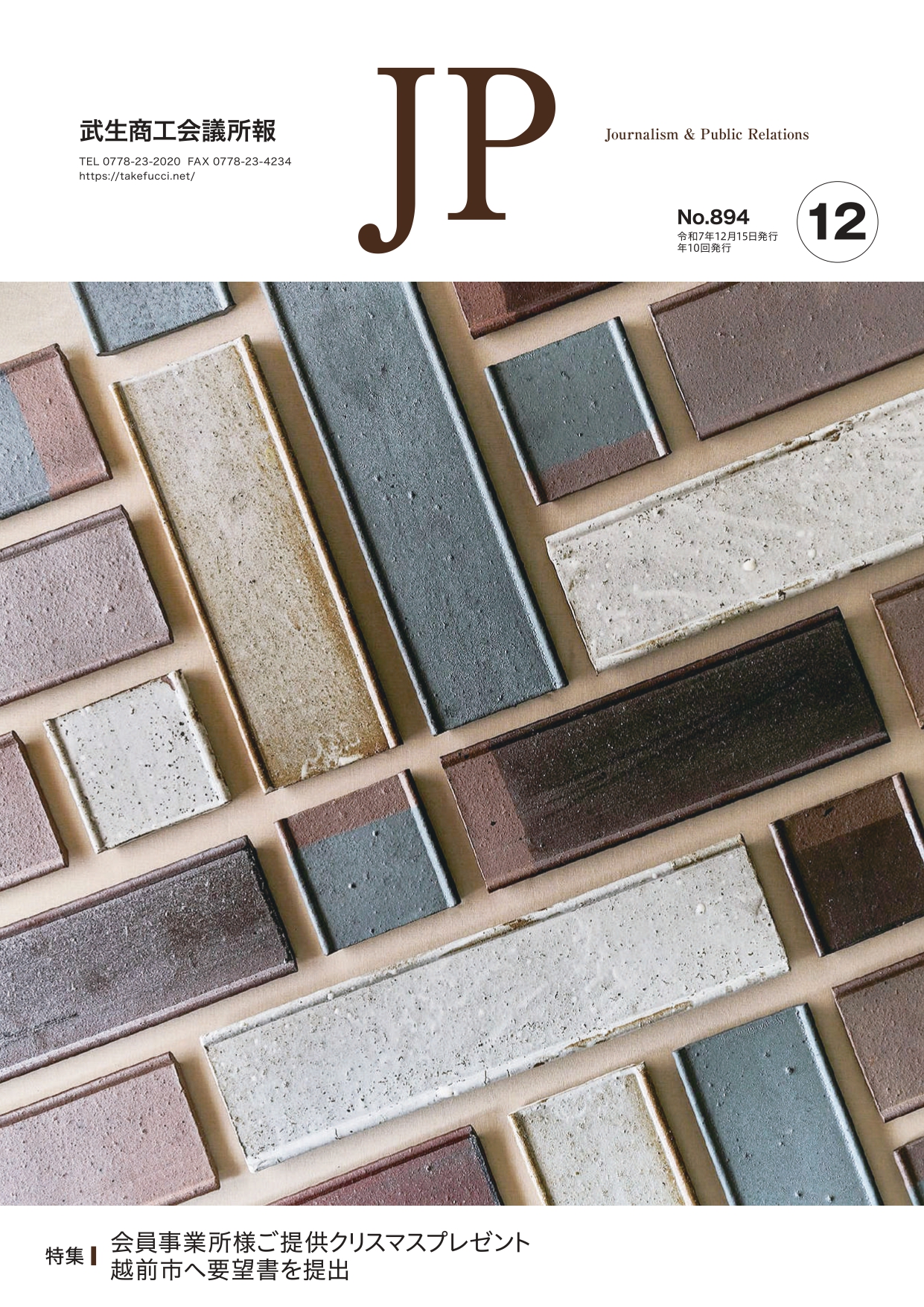 2025年12月 第894号 2025年12月 第894号 お知らせ 2025.12.15 お知らせ会報誌 R7-12_jp894ダウンロード 特集:会員事業所様ご提供クリスマスプレゼント 越前市へ要望書を提出 ・会議所の動き ・会議所からのお知らせ ・今月のNiceSmile ・青年部だより ・関係機関からのお知らせ ・会議所カレンダー/お知らせ/広報委員の雑感