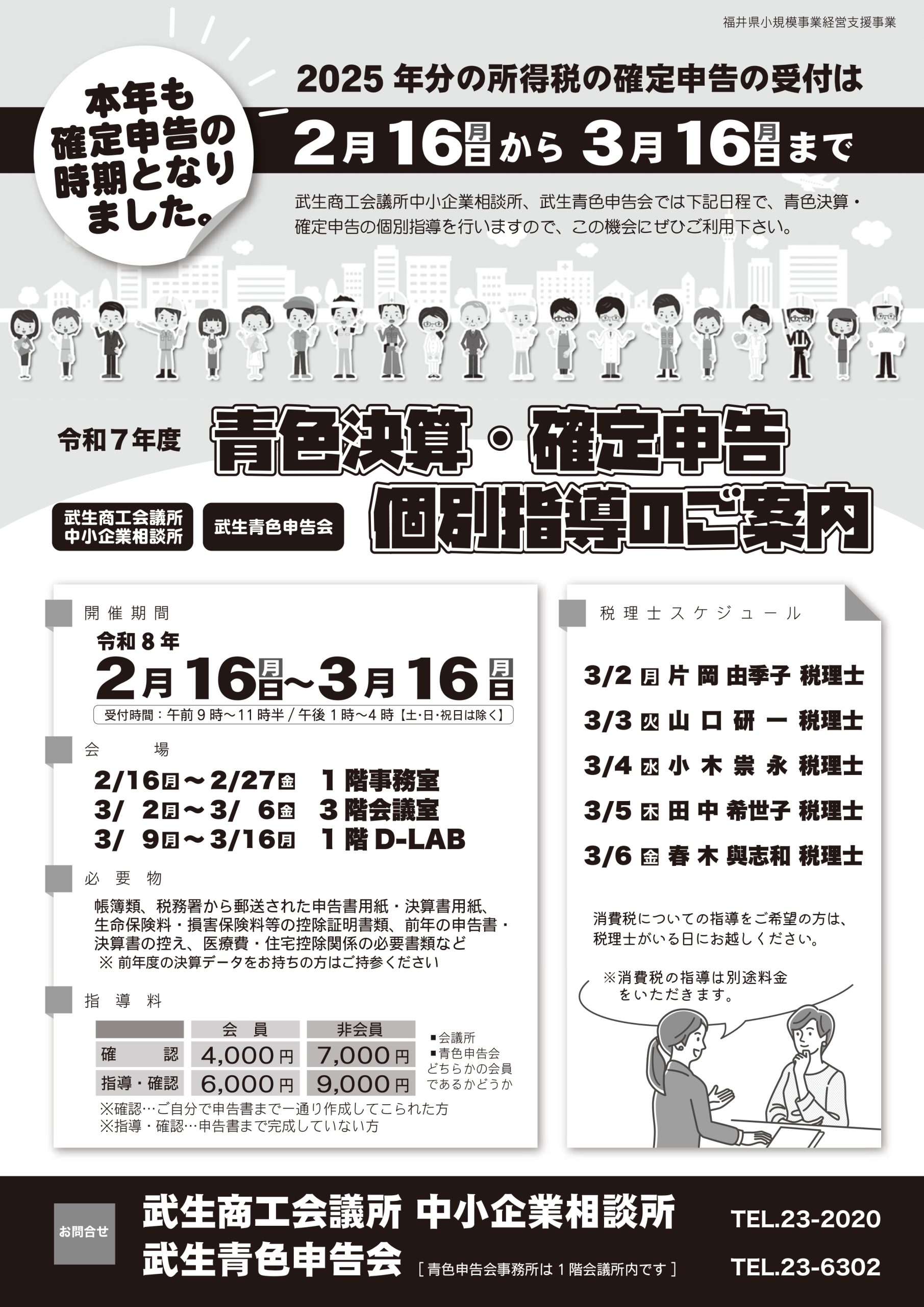 武生商工会議所中小企業相談所・青色申告会では、下記の日程で個別指導を行います。