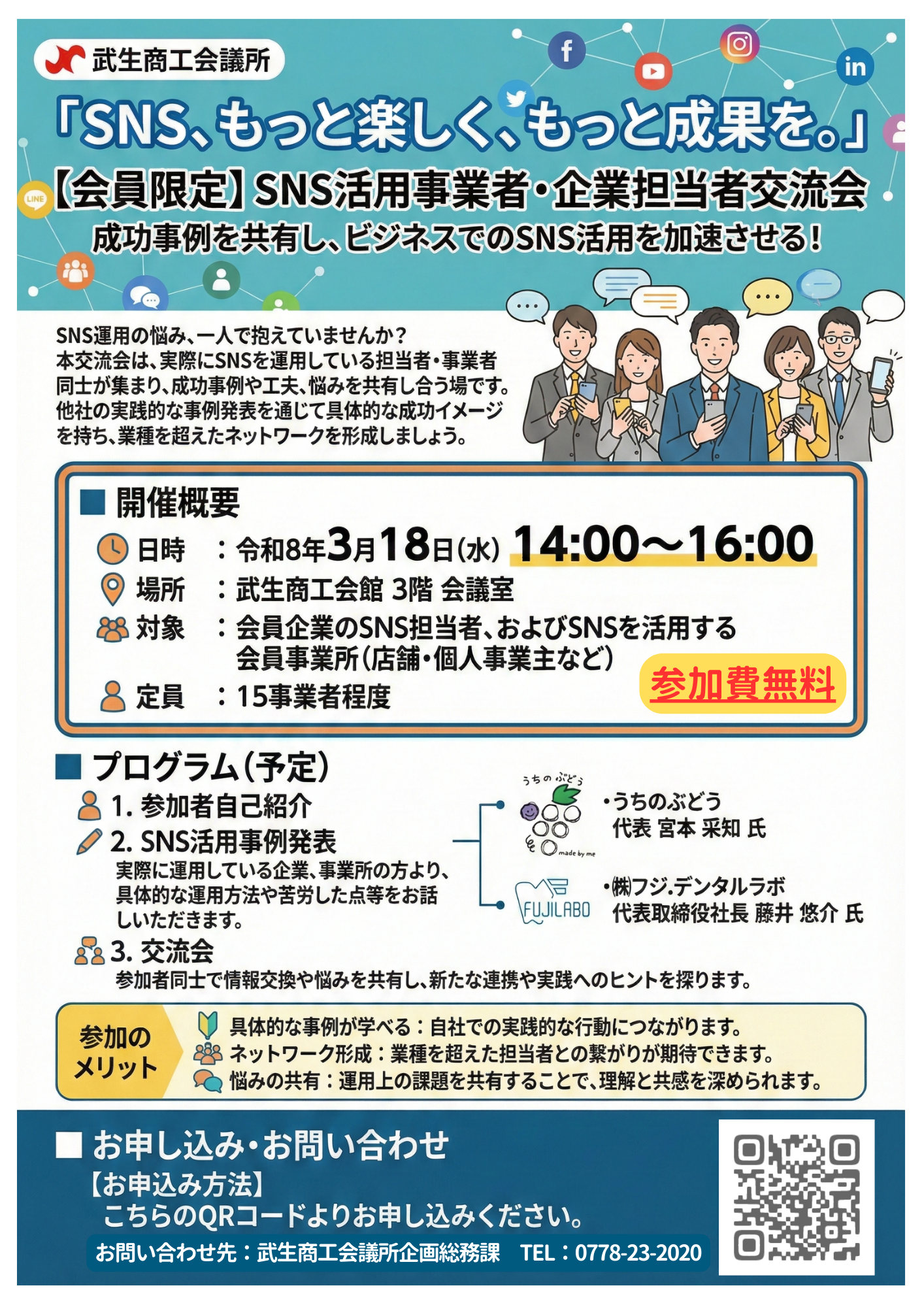 | 対象 | 会員企業のSNS担当者、およびSNSを活用する会員事業所(店舗・個人事業主など) |