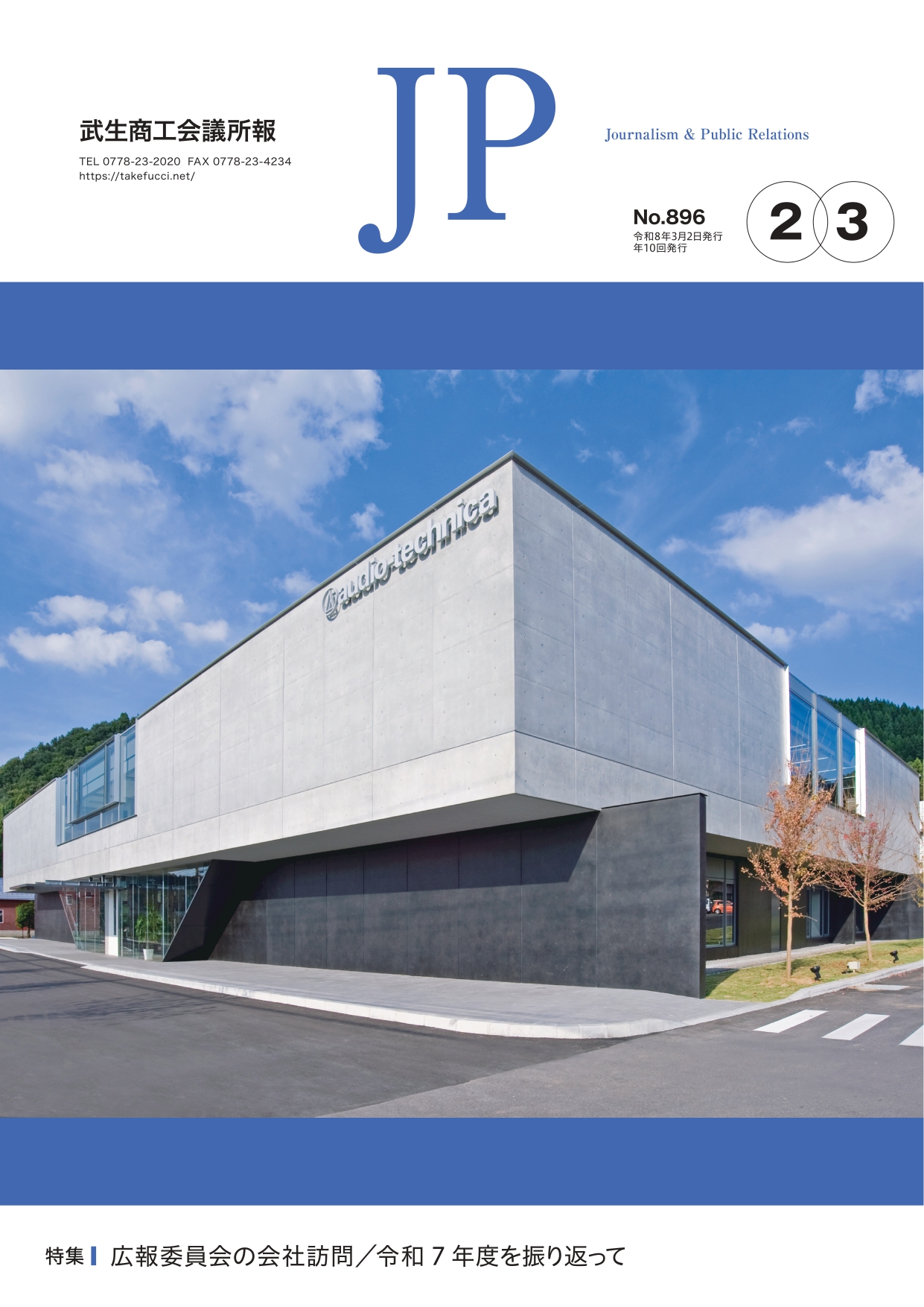 2026年2・3月合併 第896号 2026年2・3月合併 第896号 お知らせ 2026.03.02 お知らせ会報誌 R8-23jp896ダウンロード 特集:広報委員会の会社訪問 令和7年度を振り返って ・会議所からのお知らせ ・会議所の動き/ようこそ新入会員さん ・今月のNice Smile ・青年部だより ・関係機関からのお知らせ ・会議所カレンダー/お知らせ/広報委員の雑感