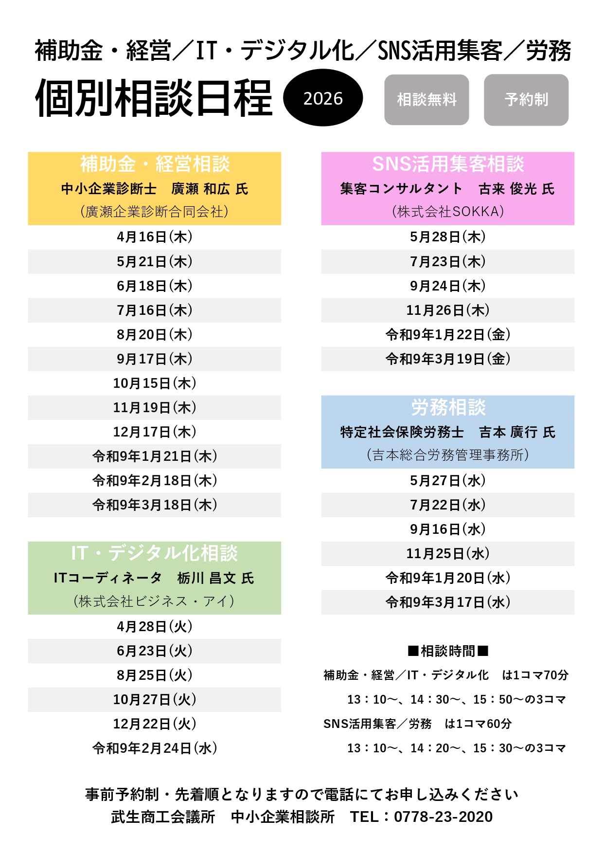 相談時間は、13:10 ~ /14:20 ~ /15:30 ~ の3コマ となります。